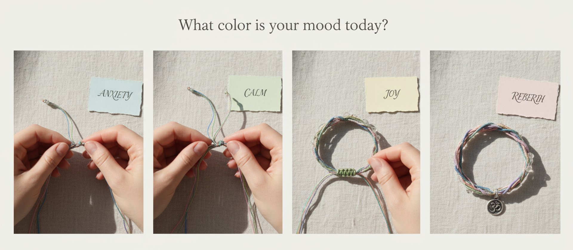 Every color holds a piece of your heart — soft pink for tenderness, warm yellow for joy, calm blue for peace, deep brown for courage, gentle purple for clarity. We weave these emotional hues into traditional Tibetan cords, turning your feelings into wearable stories. Each thread is a whisper of your mood, each knot a bond between you and your inner self.
